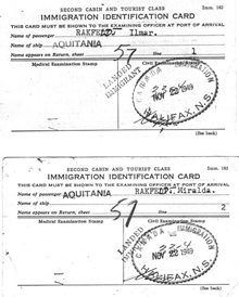 Notre voyage au Canada, moi-même, (Arnold et Heli), Ilmar, et Miralda Rakfeldt et mes enfants, Helle, Tiia et Jaak Rakfeldt a commencé le 14 novembre 1949 de Stockholm à Goteborg en Suède, puis il nous a amenés à Londres en Angleterre où nous sommes arrivés le 14 novembre 1949. Nous avons embarqué à Southampton le 15 novembre 1949 à bord de l’Aquitania et sommes arrivés à Halifax en Nouvelle-Écosse le 22 novembre 1949.