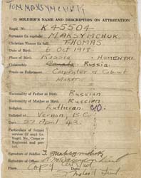 Thomas Maksymchuk est né en Ukraine le 15 janvier 1917. Il a immigré au Canada en juin 1930 avec ses parents, Andrew et Anna Maksymchuk, qui avaient changé sa date de naissance sur ses documents (6 octobre 1918) pour qu'il puisse faire la traversée à demi-tarif.